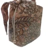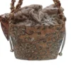 Con unas dimensiones de 18 cm de largo, 12 cm de ancho y 17 cm de alto, el bolso «Nápoles» presenta un distintivo tejido de corcho adornado con un elegante bordado floral en tonos metálicos, convirtiéndolo en el compañero perfecto para quienes buscan un accesorio original y con personalidad para el día a día o para ocasiones especiales. Su diseño tipo bombonera, con cierre ajustable mediante cordones, le confiere un aire desenfadado y práctico, mientras que la textura natural del corcho y el brillo del bordado elevan su estética a una nueva dimensión. Los detalles en piel en un tono marrón a juego complementan su diseño único.