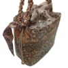 Este bolso ofrece múltiples opciones de transporte gracias a sus asas de cadena dorada entrelazadas con un pañuelo estampado y a su asa bandolera ajustable y extraíble en piel marrón, permitiéndote llevarlo cómodamente de la manera que prefieras. Los detalles metálicos en tono dorado realzan su belleza artesanal.