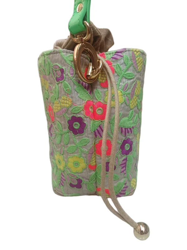 Con unas dimensiones de 18 cm de largo, 12 cm de ancho y 17 cm de alto, el bolso «Nápoles» presenta un alegre tejido base en tono neutro adornado con un exquisito bordado floral en una vibrante paleta de colores que incluye rosas, amarillos, morados y verdes, convirtiéndolo en el compañero perfecto para añadir un toque de energía y arte a tu estilo, ya sea para el día a día o para ocasiones especiales. Su diseño tipo bombonera, con cierre ajustable mediante cordones, le confiere un aire desenfadado y práctico, mientras que el bordado multicolor eleva su estética a una dimensión alegre y festiva. Los detalles en piel en un llamativo color verde lima aportan un contraste moderno y divertido.